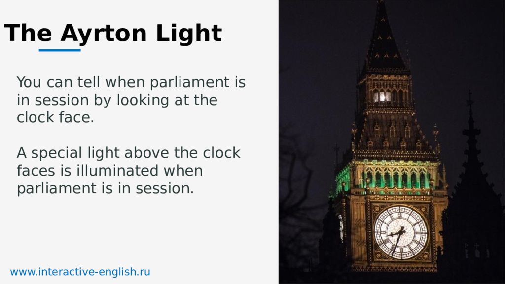 You can tell when parliament is in session by looking at the clock face. A special light above the clock faces is illuminated when parliament is in session. T he Ayrton Light www.interactive-english.ru
