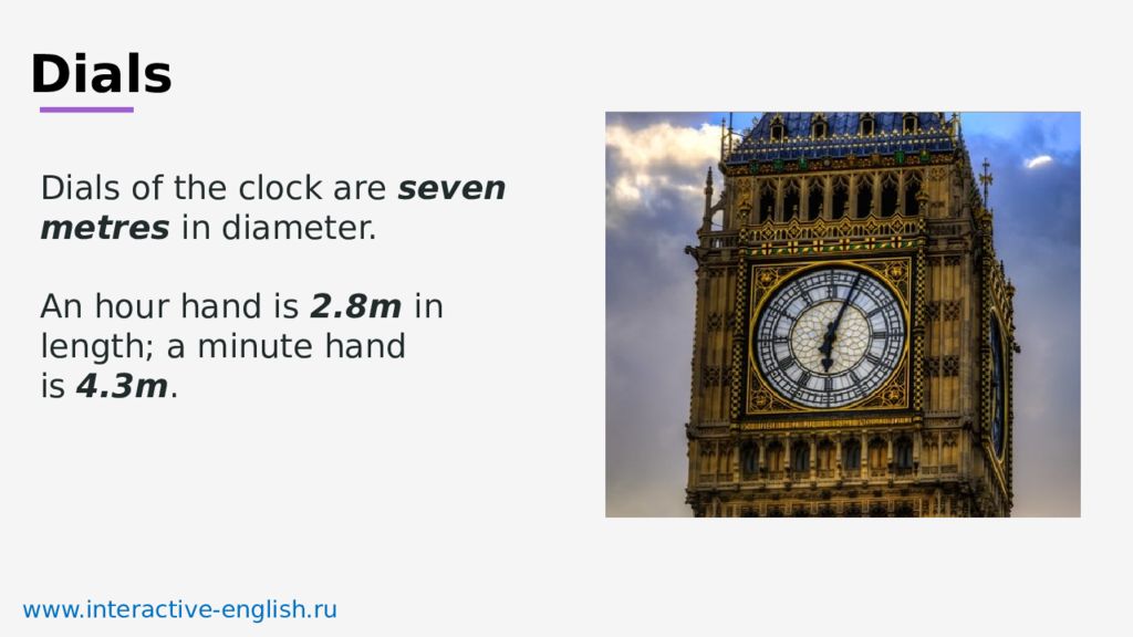 Dials of the clock are seven metres in diameter. An hour hand is 2.8m in length; a minute hand is 4.3m. Dials www.interactive-english.ru