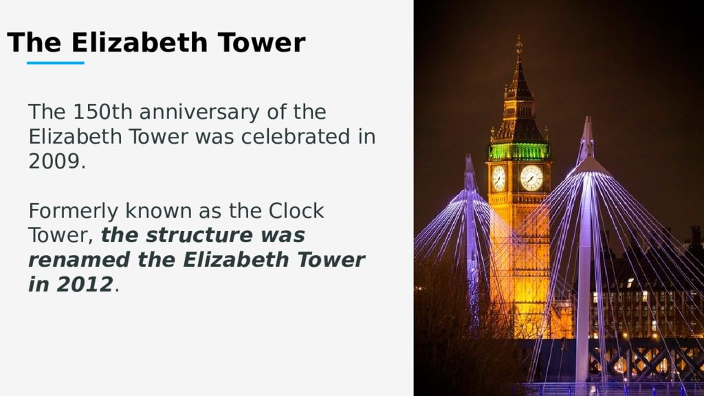 The 150th anniversary of the Elizabeth Tower was celebrated in 2009. Formerly known as the Clock Tower, the structure was renamed the Elizabeth Tower in 2012. The Elizabeth Tower