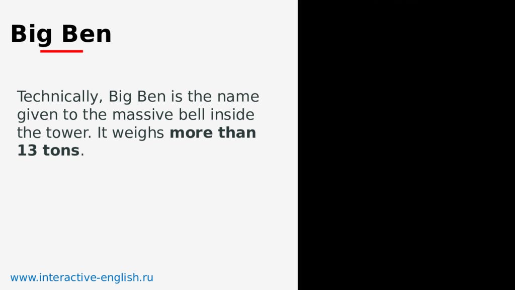 Technically, Big Ben is the name given to the massive bell inside the tower. It weighs more than 13 tons. Big Ben www.interactive-english.ru