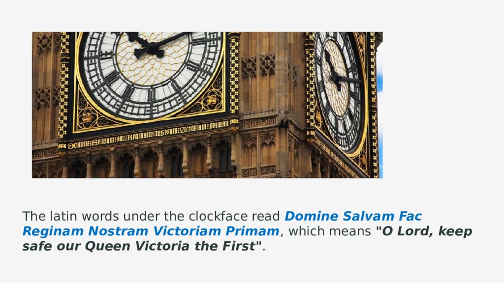 The latin words under the clockface read Domine Salvam Fac Reginam Nostram Victoriam Primam, which means " O Lord, keep safe our Queen Victoria the First ".