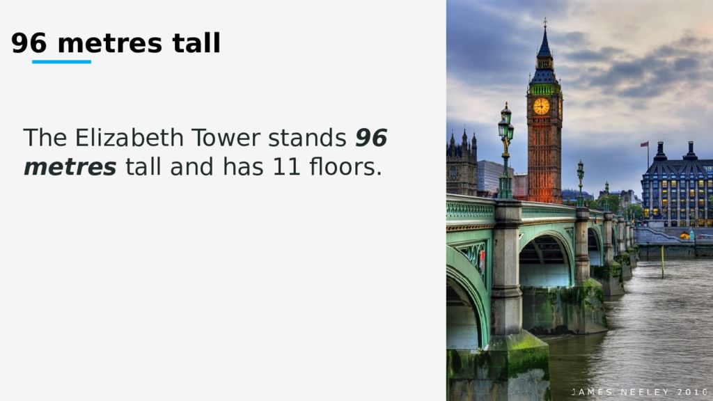 The Elizabeth Tower stands 96 metres tall and has 11 floors. 96 metres tall