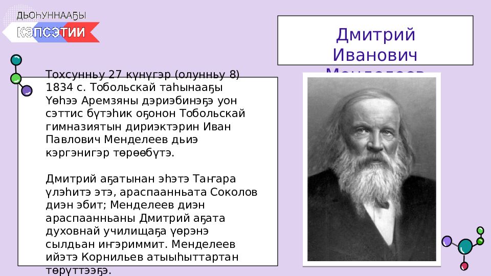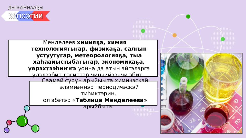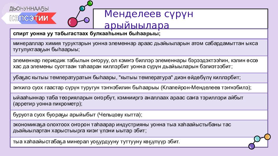 Менделеев химияҕа, химия технологиятыгар, физикаҕа, салгын устуутугар, метеорологияҕа, тыа хаһаайыстыбатыгар, экономикаҕа, үөрэхтээһиҥҥэ уонна да атын эйгэлэргэ үлэлээбит дэгиттэр чинчийээччи эбит. Саамай сүрүн арыйыыта химичэскэй элэмиэннэр периодичэскэй тиһиктэрин, ол эбэтэр « Таблица Менделеева » арыйбыта.