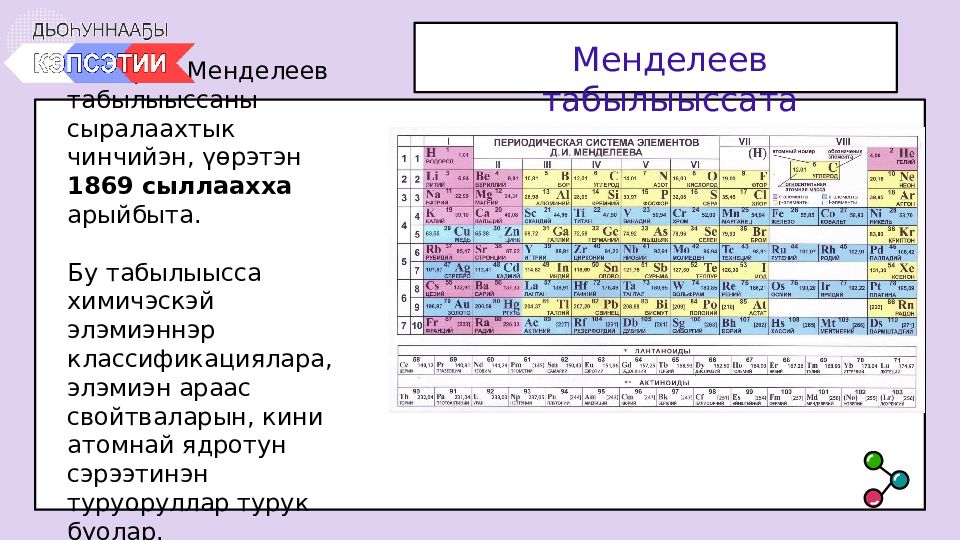Дмитрий Менделеев табылыыссаны сыралаахтык чинчийэн, үөрэтэн 1869 сыллаахха арыйбыта. Бу табылыысса химичэскэй элэмиэннэр классификациялара, элэмиэн араас свойтваларын, кини атомнай ядротун сэрээтинэн туруоруллар турук буолар.