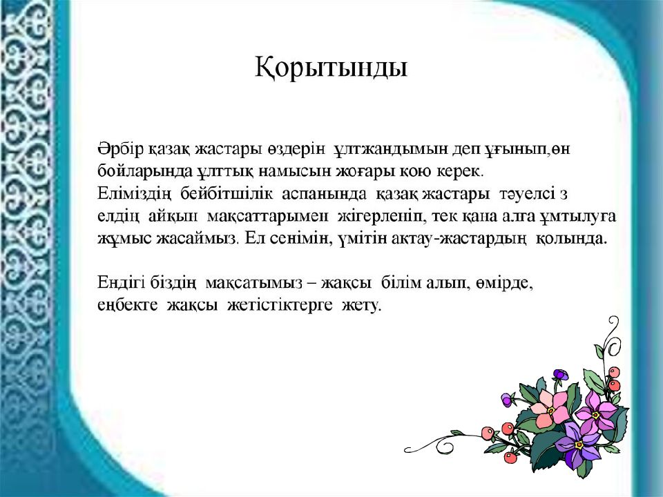 Білімді ұрпақ- ел болашағы. “Саналы ұрпақ- жарқын болашақ”