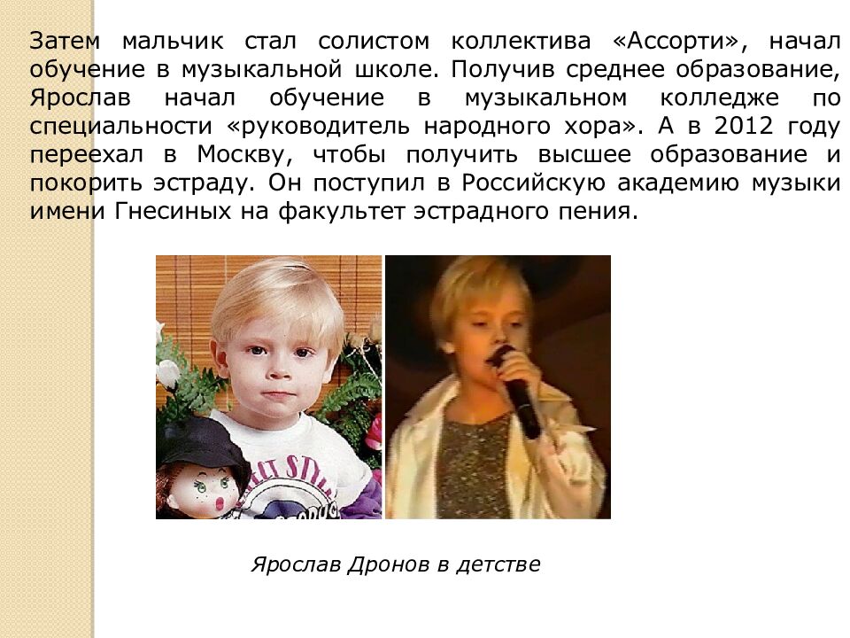 Затем мальчик стал солистом коллектива «Ассорти», начал обучение в музыкальной школе. Получив среднее образование, Ярослав начал обучение в музыкальном колледже по специальности «руководитель народного хора». А в 2012 году переехал в Москву, чтобы получить высшее образование и покорить эстраду. Он поступил в Российскую академию музыки имени Гнесиных на факультет эстрадного пения. Ярослав Дронов в детстве