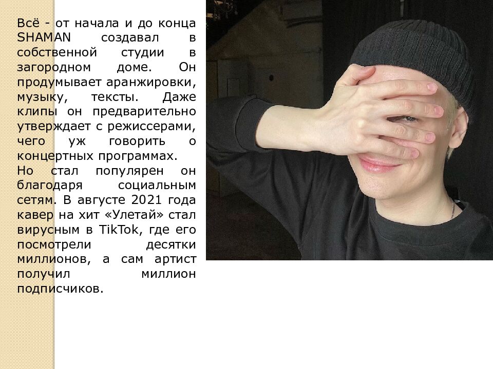 Всё - от начала и до конца SHAMAN создавал в собственной студии в загородном доме. Он продумывает аранжировки, музыку, тексты. Даже клипы он предварительно утверждает с режиссерами, чего уж говорить о концертных программах. Но стал популярен он благодаря социальным сетям. В августе 2021 года кавер на хит «Улетай» стал вирусным в TikTok, где его посмотрели десятки миллионов, а сам артист получил миллион подписчиков.