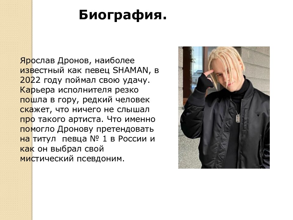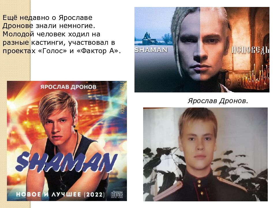 Биография. Ярослав Дронов, наиболее известный как певец SHAMAN, в 2022 году поймал свою удачу. Карьера исполнителя резко пошла в гору, редкий человек скажет, что ничего не слышал про такого артиста. Что именно помогло Дронову претендовать на титул певца № 1 в России и как он выбрал свой мистический псевдоним.