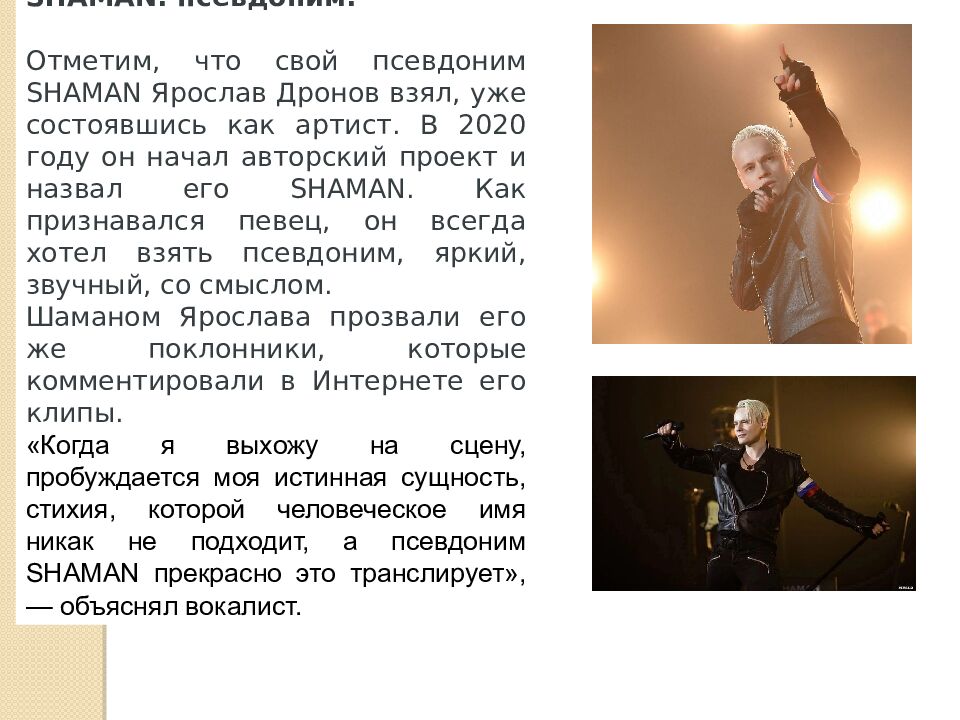 SHAMAN: псевдоним. Отметим, что свой псевдоним SHAMAN Ярослав Дронов взял, уже состоявшись как артист. В 2020 году он начал авторский проект и назвал его SHAMAN. Как признавался певец, он всегда хотел взять псевдоним, яркий, звучный, со смыслом. Шаманом Ярослава прозвали его же поклонники, которые комментировали в Интернете его клипы. «Когда я выхожу на сцену, пробуждается моя истинная сущность, стихия, которой человеческое имя никак не подходит, а псевдоним SHAMAN прекрасно это транслирует», — объяснял вокалист.