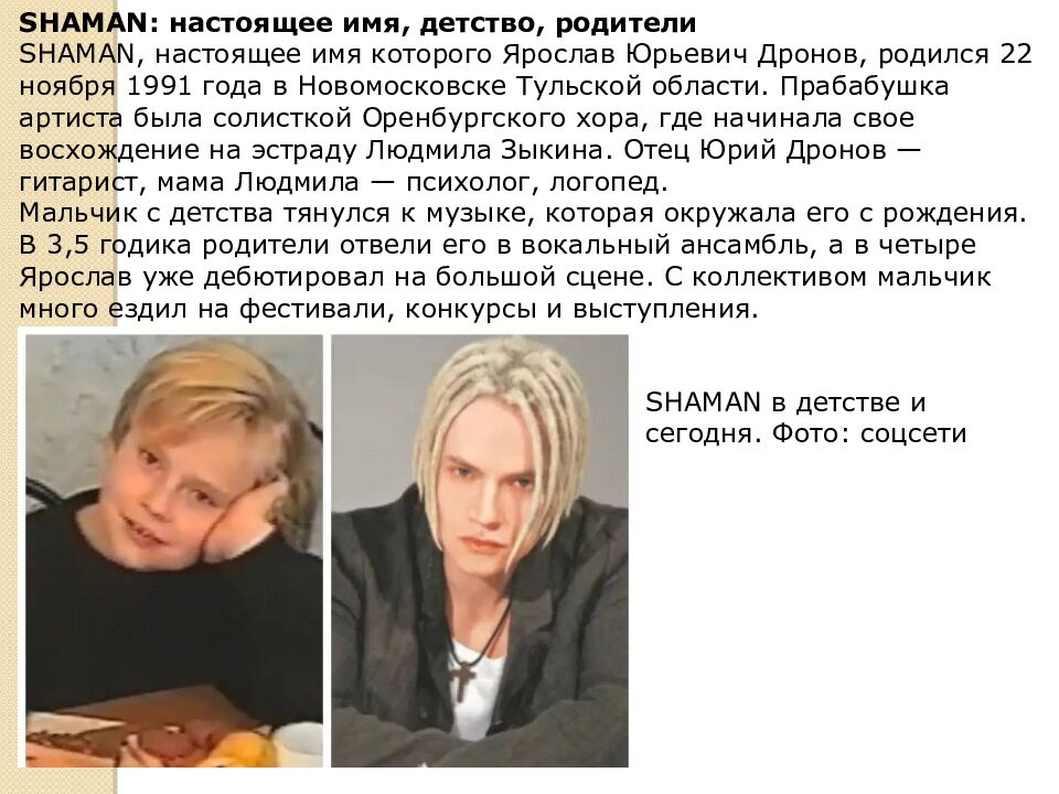 SHAMAN: настоящее имя, детство, родители SHAMAN, настоящее имя которого Ярослав Юрьевич Дронов, родился 22 ноября 1991 года в Новомосковске Тульской области. Прабабушка артиста была солисткой Оренбургского хора, где начинала свое восхождение на эстраду Людмила Зыкина. Отец Юрий Дронов — гитарист, мама Людмила — психолог, логопед. Мальчик с детства тянулся к музыке, которая окружала его с рождения. В 3,5 годика родители отвели его в вокальный ансамбль, а в четыре Ярослав уже дебютировал на большой сцене. С коллективом мальчик много ездил на фестивали, конкурсы и выступления. SHAMAN в детстве и сегодня. Фото: соцсети