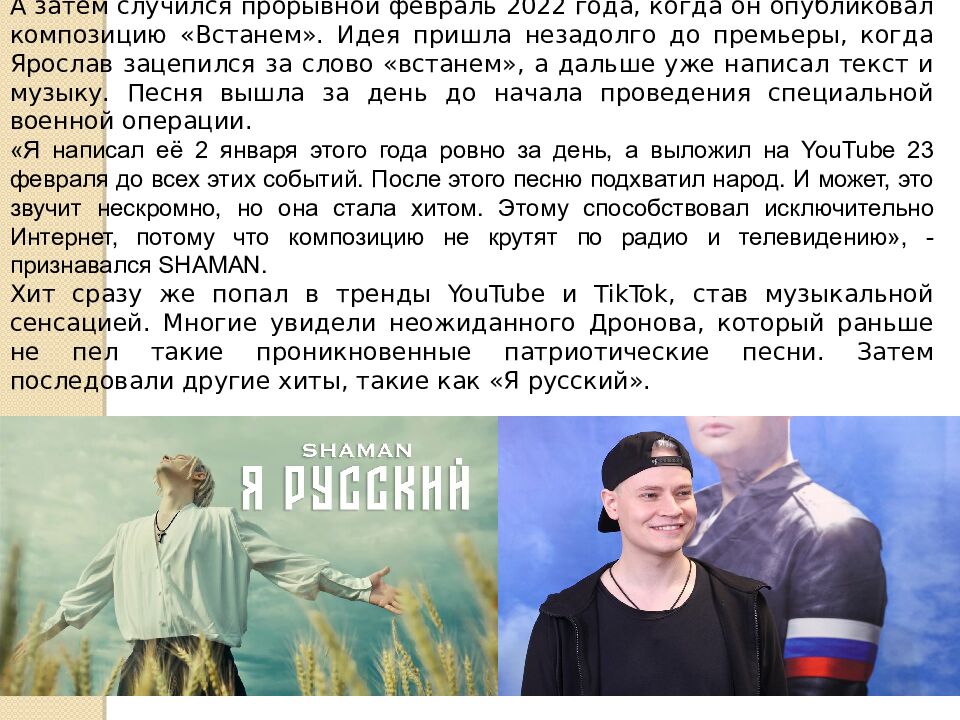А затем случился прорывной февраль 2022 года, когда он опубликовал композицию «Встанем». Идея пришла незадолго до премьеры, когда Ярослав зацепился за слово «встанем», а дальше уже написал текст и музыку. Песня вышла за день до начала проведения специальной военной операции. «Я написал её 2 января этого года ровно за день, а выложил на YouTube 23 февраля до всех этих событий. После этого песню подхватил народ. И может, это звучит нескромно, но она стала хитом. Этому способствовал исключительно Интернет, потому что композицию не крутят по радио и телевидению», - признавался SHAMAN. Хит сразу же попал в тренды YouTube и TikTok, став музыкальной сенсацией. Многие увидели неожиданного Дронова, который раньше не пел такие проникновенные патриотические песни. Затем последовали другие хиты, такие как «Я русский».