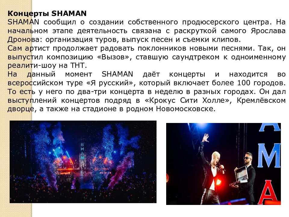Концерты SHAMAN SHAMAN сообщил о создании собственного продюсерского центра. На начальном этапе деятельность связана с раскруткой самого Ярослава Дронова: организация туров, выпуск песен и съемки клипов. Сам артист продолжает радовать поклонников новыми песнями. Так, он выпустил композицию «Вызов», ставшую саундтреком к одноименному реалити-шоу на ТНТ. На данный момент SHAMAN даёт концерты и находится во всероссийском туре «Я русский», который включает более 100 городов. То есть у него по два-три концерта в неделю в разных городах. Он дал выступлений концертов подряд в «Крокус Сити Холле», Кремлёвском дворце, а также на стадионе в родном Новомосковске.