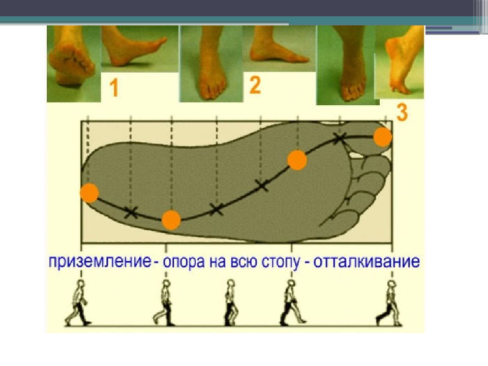 - супинация стопы — варус пятки и переднего отделов -пронация стопы — вальгус переднего отдела и пятки, распластывание стопы . -вновь пронация стопы, при которой суставы стопы замыкаются и стопа приобретает жёсткость, необходимую для передачи энергии верхним сегментам.