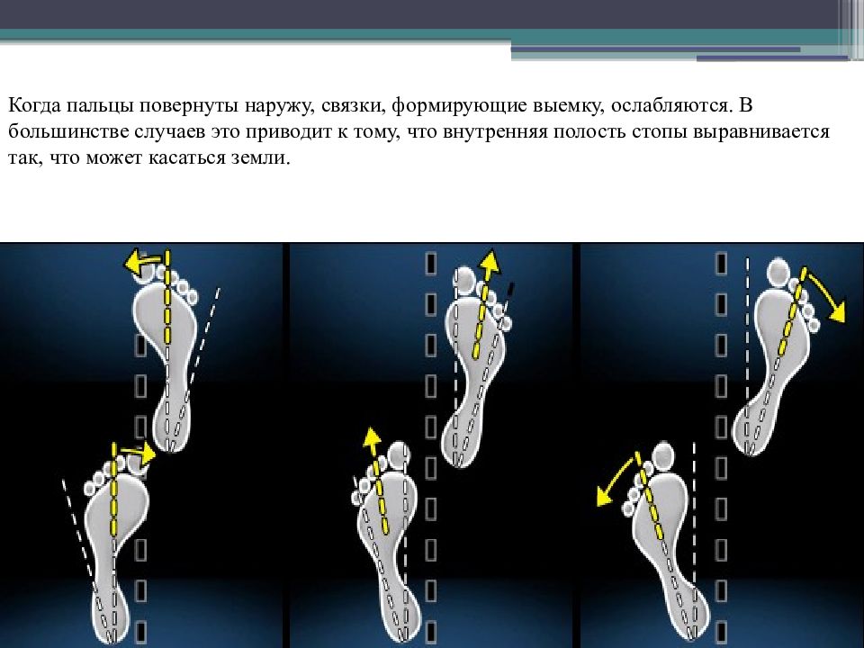 Когда пальцы повернуты наружу, связки, формирующие выемку, ослабляются. В большинстве случаев это приводит к тому, что внутренняя полость стопы выравнивается так, что может касаться земли.