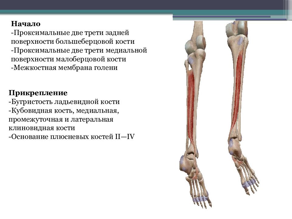 Начало -Проксимальные две трети задней поверхности большеберцовой кости -Проксимальные две трети медиальной поверхности малоберцовой кости -Межкостная мембрана голени Прикрепление -Бугристость ладьевидной кости -Кубовидная кость, медиальная, промежуточная и латеральная клиновидная кости -Основание плюсневых костей II—IV