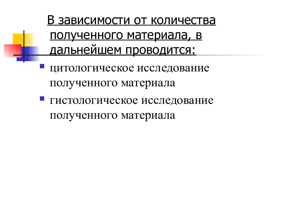 В зависимости от количества полученного материала, в дальнейшем проводится: цитологическое исследование полученного материала гистологическое исследование полученного материала