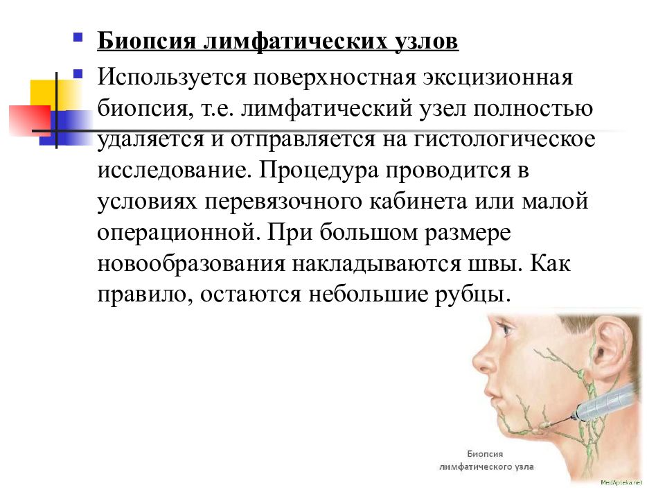 Биопсия лимфатических узлов Используется поверхностная эксцизионная биопсия, т.е. лимфатический узел полностью удаляется и отправляется на гистологическое исследование. Процедура проводится в условиях перевязочного кабинета или малой операционной. При большом размере новообразования накладываются швы. Как правило, остаются небольшие рубцы.