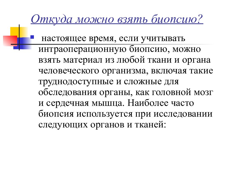 настоящее время, если учитывать интраоперационную биопсию, можно взять материал из любой ткани и органа человеческого организма, включая такие труднодоступные и сложные для обследования органы, как головной мозг и сердечная мышца. Наиболее часто биопсия используется при исследовании следующих органов и тканей: