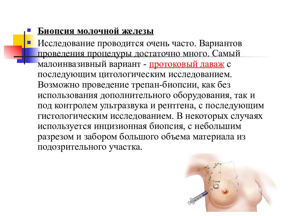 Биопсия молочной железы Исследование проводится очень часто. Вариантов проведения процедуры достаточно много. Самый малоинвазивный вариант - протоковый лаваж с последующим цитологическим исследованием. Возможно проведение трепан-биопсии, как без использования дополнительного оборудования, так и под контролем ультразвука и рентгена, с последующим гистологическим исследованием. В некоторых случаях используется инцизионная биопсия, с небольшим разрезом и забором большого объема материала из подозрительного участка.