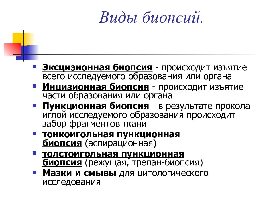 Эксцизионная биопсия - происходит изъятие всего исследуемого образования или органа Инцизионная биопсия - происходит изъятие части образования или органа Пункционная биопсия - в результате прокола иглой исследуемого образования происходит забор фрагментов ткани тонкоигольная пункционная биопсия (аспирационная) толстоигольная пункционная биопсия (режущая, трепан-биопсия) Мазки и смывы для цитологического исследования