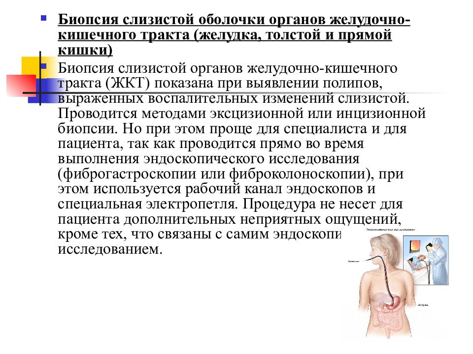 Биопсия слизистой оболочки органов желудочно-кишечного тракта (желудка, толстой и прямой кишки) Биопсия слизистой органов желудочно-кишечного тракта (ЖКТ) показана при выявлении полипов, выраженных воспалительных изменений слизистой. Проводится методами эксцизионной или инцизионной биопсии. Но при этом проще для специалиста и для пациента, так как проводится прямо во время выполнения эндоскопического исследования (фиброгастроскопии или фиброколоноскопии), при этом используется рабочий канал эндоскопов и специальная электропетля. Процедура не несет для пациента дополнительных неприятных ощущений, кроме тех, что связаны с самим эндоскопическим исследованием.