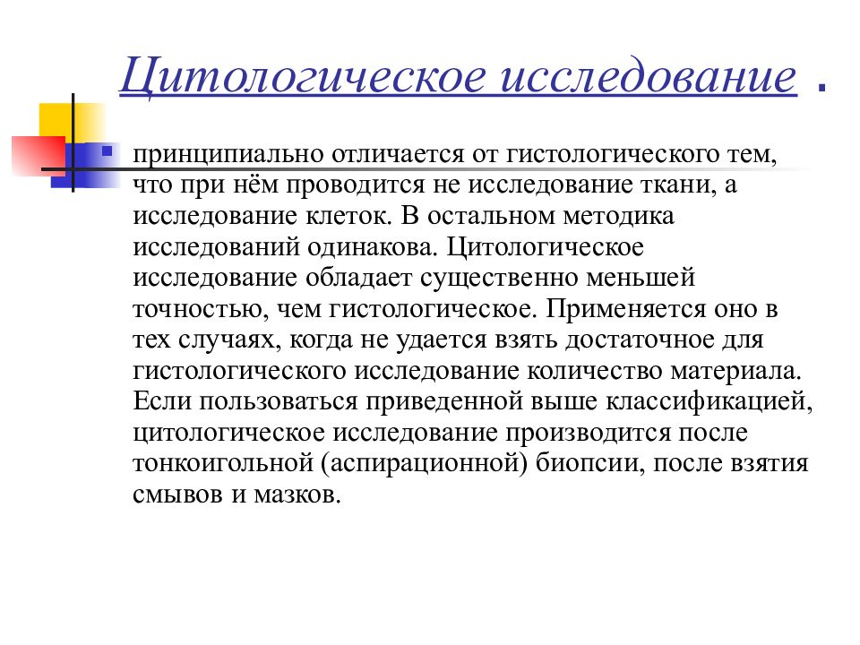 принципиально отличается от гистологического тем, что при нём проводится не исследование ткани, а исследование клеток. В остальном методика исследований одинакова. Цитологическое исследование обладает существенно меньшей точностью, чем гистологическое. Применяется оно в тех случаях, когда не удается взять достаточное для гистологического исследование количество материала. Если пользоваться приведенной выше классификацией, цитологическое исследование производится после тонкоигольной (аспирационной) биопсии, после взятия смывов и мазков.