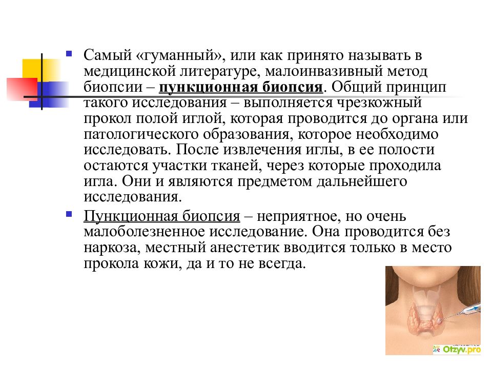 Самый «гуманный», или как принято называть в медицинской литературе, малоинвазивный метод биопсии – пункционная биопсия. Общий принцип такого исследования – выполняется чрезкожный прокол полой иглой, которая проводится до органа или патологического образования, которое необходимо исследовать. После извлечения иглы, в ее полости остаются участки тканей, через которые проходила игла. Они и являются предметом дальнейшего исследования. Пункционная биопсия – неприятное, но очень малоболезненное исследование. Она проводится без наркоза, местный анестетик вводится только в место прокола кожи, да и то не всегда.