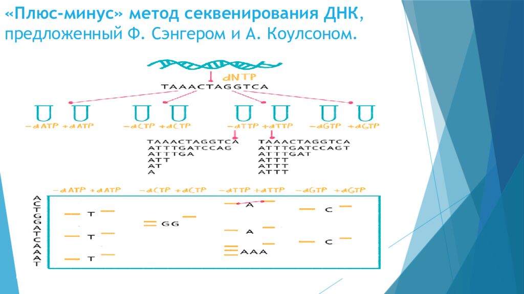 Слайд 19: Плюс-минус» метод секвенирования ДНК, предложенный Ф. Сэнгером и А. Коулсоном