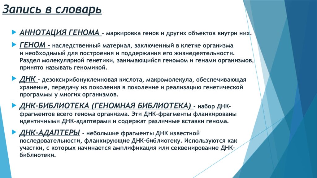 АННОТАЦИЯ ГЕНОМА – маркировка генов и других объектов внутри них. ГЕНОМ - наследственный материал, заключенный в клетке организма и необходимый для построения и поддержания его жизнедеятельности. Раздел молекулярной генетики, занимающийся геномом и генами организмов, принято называть геномикой. ДНК - дезоксирибонуклеиновая кислота, макромолекула, обеспечивающая хранение, передачу из поколения в поколение и реализацию генетической программы у многих организмов. ДНК-БИБЛИОТЕКА (ГЕНОМНАЯ БИБЛИОТЕКА ) - набор ДНК-фрагментов всего генома организма. Эти ДНК-фрагменты фланкированы идентичными ДНК-адаптерами и содержат различные вставки генома. ДНК-АДАПТЕРЫ - небольшие фрагменты ДНК известной последовательности, фланкирующие ДНК-библиотеку. Используются как участки, с которых начинается амплификация или секвенирование ДНК-библиотеки.