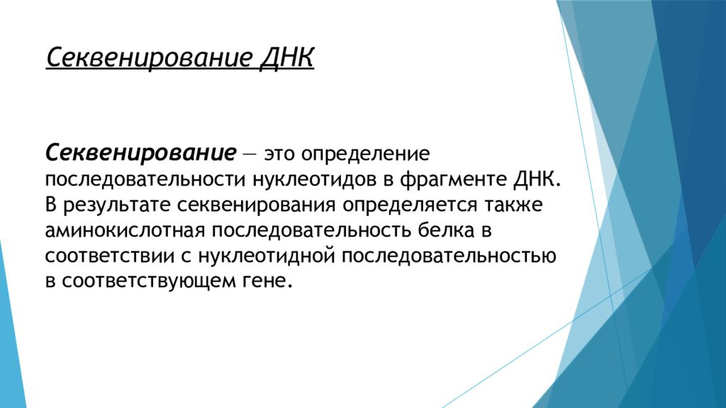 Секвенирование — это определение последовательности нуклеотидов в фрагменте ДНК. В результате секвенирования определяется также аминокислотная последовательность белка в соответствии с нуклеотидной последовательностью в соответствующем гене.
