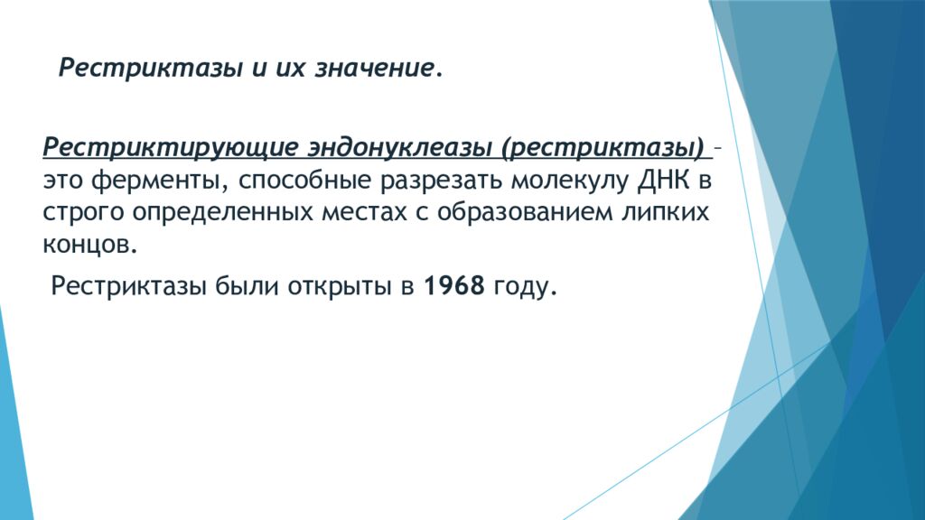 Рестриктирующие эндонуклеазы ( рестриктазы ) – это ферменты, способные разрезать молекулу ДНК в строго определенных местах с образованием липких концов. Рестриктазы были открыты в 1968 году.