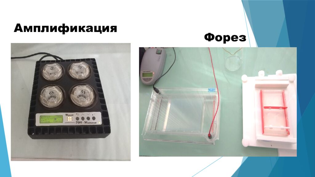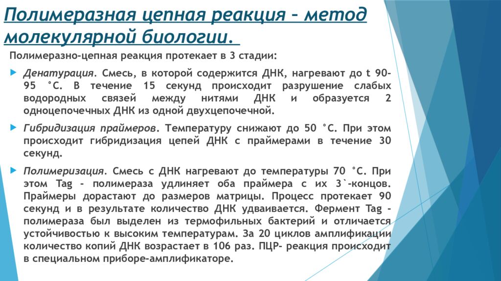 Полимеразно -цепная реакция протекает в 3 стадии: Денатурация. Смесь, в которой содержится ДНК, нагревают до t 90-95 ° С. В течение 15 секунд происходит разрушение слабых водородных связей между нитями ДНК и образуется 2 одноцепочечных ДНК из одной двухцепочечной. Гибридизация праймеров. Температуру снижают до 50 °С. При этом происходит гибридизация цепей ДНК с праймерами в течение 30 секунд. Полимеризация. Смесь с ДНК нагревают до температуры 70 °С. При этом Tag - полимераза удлиняет оба праймера с их 3`-концов. Праймеры дорастают до размеров матрицы. Процесс протекает 90 секунд и в результате количество ДНК удваивается. Фермент Tag -полимераза был выделен из термофильных бактерий и отличается устойчивостью к высоким температурам. За 20 циклов амплификации количество копий ДНК возрастает в 106 раз. ПЦР- реакция происходит в специальном приборе- амплификаторе.