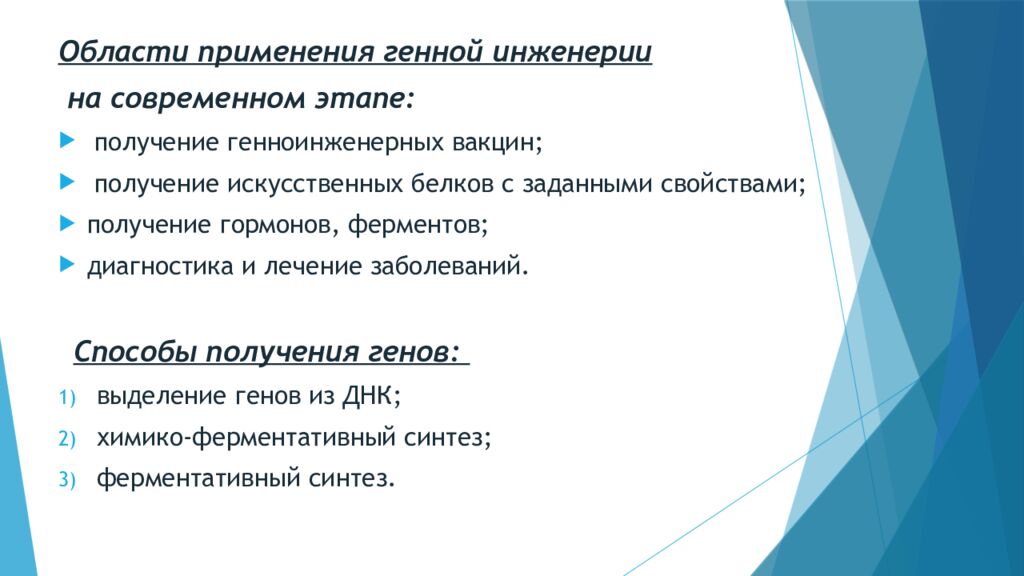 Области применения генной инженерии на современном этапе: получение генноинженерных вакцин; получение искусственных белков с заданными свойствами; получение гормонов, ферментов; диагностика и лечение заболеваний. Способы получения генов: выделение генов из ДНК; химико-ферментативный синтез; ферментативный синтез.
