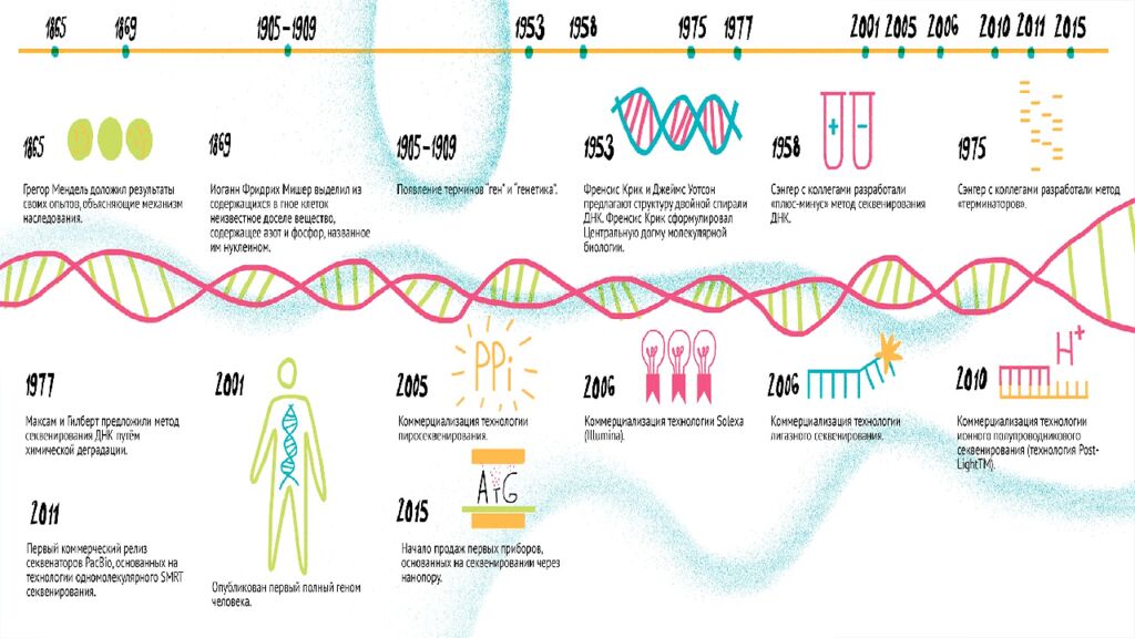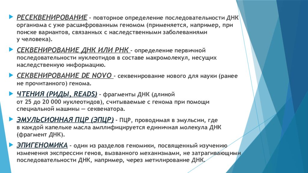 РЕСЕКВЕНИРОВАНИЕ - повторное определение последовательности ДНК организма с уже расшифрованным геномом (применяется, например, при поиске вариантов, связанных с наследственными заболеваниями у человека). СЕКВЕНИРОВАНИЕ ДНК ИЛИ РНК - определение первичной последовательности нуклеотидов в составе макромолекул, несущих наследственную информацию. СЕКВЕНИРОВАНИЕ DE NOVO - секвенирование нового для науки (ранее не прочитанного) генома. ЧТЕНИЯ (РИДЫ, READS ) - фрагменты ДНК (длиной от 25 до 20 000 нуклеотидов), считываемые с генома при помощи специальной машины — секвенатора. ЭМУЛЬСИОННАЯ ПЦР (ЭПЦР ) - ПЦР, проводимая в эмульсии, где в каждой капельке масла амплифицируется единичная молекула ДНК (фрагмент ДНК ). ЭПИГЕНОМИКА - один из разделов геномики, посвященный изучению изменения экспрессии генов, вызванного механизмами, не затрагивающими последовательности ДНК, например, через метилирование ДНК.