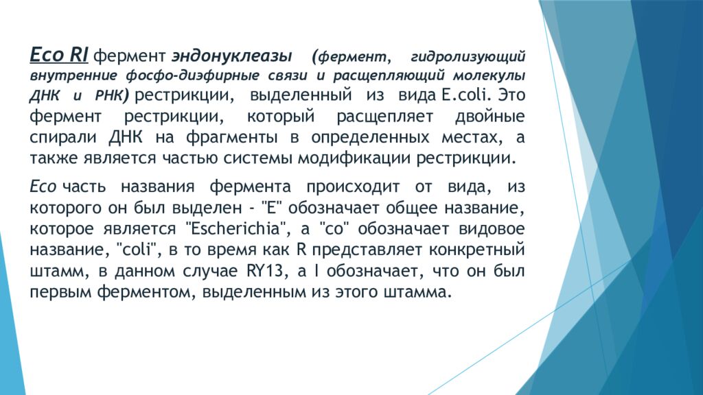 Eco RI фермент эндонуклеазы ( фермент, гидролизующий внутренние фосфо-диэфирные связи и расщепляющий молекулы ДНК и РНК ) рестрикции, выделенный из вида Е. coli. Это фермент рестрикции, который расщепляет двойные спирали ДНК на фрагменты в определенных местах, а также является частью системы модификации рестрикции. Eco часть названия фермента происходит от вида, из которого он был выделен - "E" обозначает общее название, которое является " Escherichia ", а " co " обозначает видовое название, " coli ", в то время как R представляет конкретный штамм, в данном случае RY13, а I обозначает, что он был первым ферментом, выделенным из этого штамма.