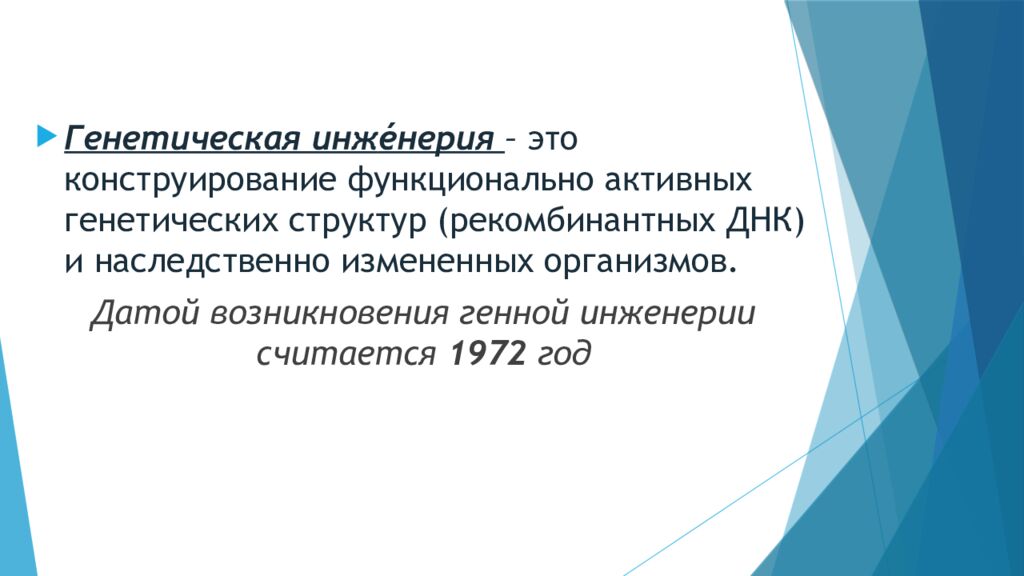 Генетическая инж é нерия – это конструирование функционально активных генетических структур (рекомбинантных ДНК) и наследственно измененных организмов. Датой возникновения генной инженерии считается 1972 год