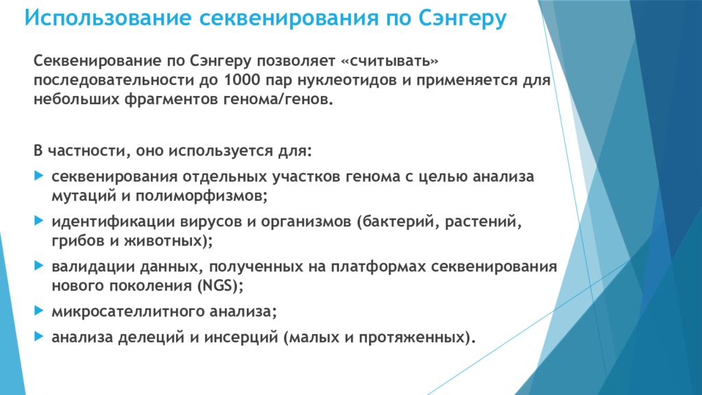 Секвенирование по Сэнгеру позволяет «считывать» последовательности до 1000 пар нуклеотидов и применяется для небольших фрагментов генома/генов. В частности, оно используется для : секвенирования отдельных участков генома с целью анализа мутаций и полиморфизмов; идентификации вирусов и организмов (бактерий, растений, грибов и животных); валидации данных, полученных на платформах секвенирования нового поколения (NGS); микросателлитного анализа; анализа делеций и инсерций (малых и протяженных).