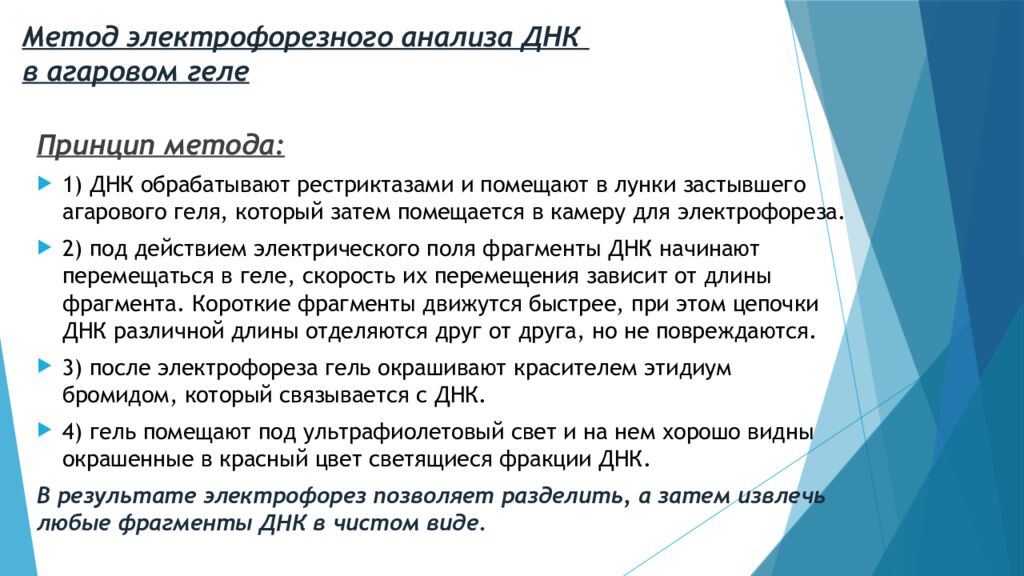 Принцип метода: 1) ДНК обрабатывают рестриктазами и помещают в лунки застывшего агарового геля, который затем помещается в камеру для электрофореза. 2) под действием электрического поля фрагменты ДНК начинают перемещаться в геле, скорость их перемещения зависит от длины фрагмента. Короткие фрагменты движутся быстрее, при этом цепочки ДНК различной длины отделяются друг от друга, но не повреждаются. 3) после электрофореза гель окрашивают красителем этидиум бромидом, который связывается с ДНК. 4) гель помещают под ультрафиолетовый свет и на нем хорошо видны окрашенные в красный цвет светящиеся фракции ДНК. В результате электрофорез позволяет разделить, а затем извлечь любые фрагменты ДНК в чистом виде.
