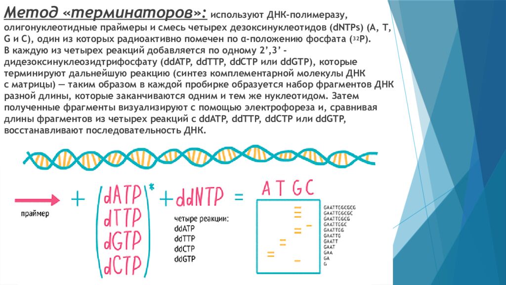 Метод «терминаторов»: используют ДНК-полимеразу, олигонуклеотидные праймеры и смесь четырех дезоксинуклеотидов ( dNTPs ) (А, Т, G и C), один из которых радиоактивно помечен по α-положению фосфата ( 32 P). В каждую из четырех реакций добавляется по одному 2’, 3’ - дидезоксинуклеозидтрифосфату ( ddATP, ddTTP, ddCTP или ddGTP ), которые терминируют дальнейшую реакцию (синтез комплементарной молекулы ДНК с матрицы) — таким образом в каждой пробирке образуется набор фрагментов ДНК разной длины, которые заканчиваются одним и тем же нуклеотидом. Затем полученные фрагменты визуализируют с помощью электрофореза и, сравнивая длины фрагментов из четырех реакций с ddATP, ddTTP, ddCTP или ddGTP, восстанавливают последовательность ДНК.