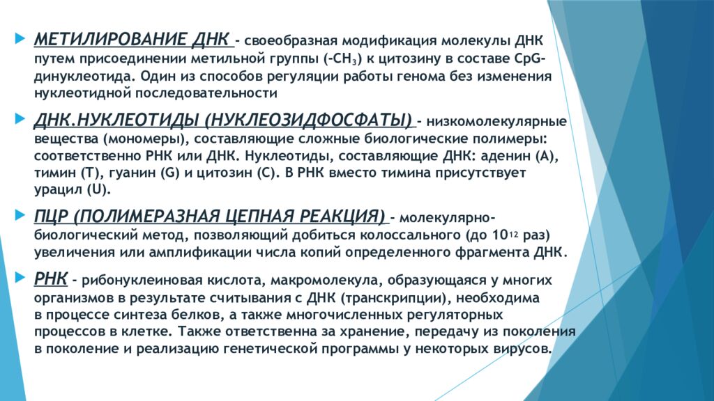 МЕТИЛИРОВАНИЕ ДНК - своеобразная модификация молекулы ДНК путем присоединении метильной группы (-CH 3 ) к цитозину в составе CpG-динуклеотида. Один из способов регуляции работы генома без изменения нуклеотидной последовательности ДНК.НУКЛЕОТИДЫ (НУКЛЕОЗИДФОСФАТЫ ) - низкомолекулярные вещества (мономеры), составляющие сложные биологические полимеры: соответственно РНК или ДНК. Нуклеотиды, составляющие ДНК: аденин (A), тимин (T), гуанин (G) и цитозин (C). В РНК вместо тимина присутствует урацил (U ). ПЦР (ПОЛИМЕРАЗНАЯ ЦЕПНАЯ РЕАКЦИЯ ) - молекулярно-биологический метод, позволяющий добиться колоссального (до 10 12 раз) увеличения или амплификации числа копий определенного фрагмента ДНК. РНК - рибонуклеиновая кислота, макромолекула, образующаяся у многих организмов в результате считывания с ДНК (транскрипции), необходима в процессе синтеза белков, а также многочисленных регуляторных процессов в клетке. Также ответственна за хранение, передачу из поколения в поколение и реализацию генетической программы у некоторых вирусов.