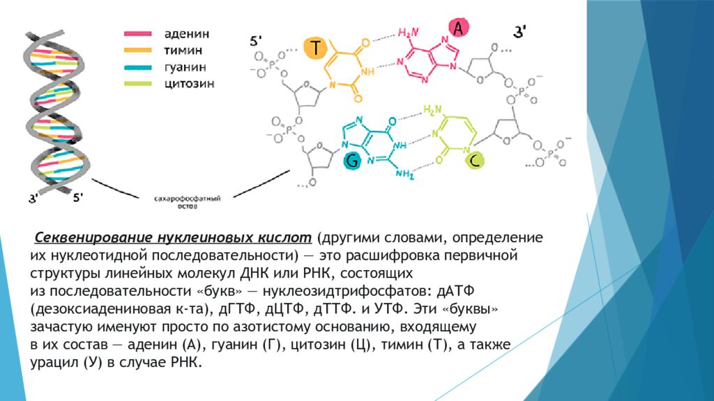 Секвенирование нуклеиновых кислот (другими словами, определение их нуклеотидной последовательности) — это расшифровка первичной структуры линейных молекул ДНК или РНК, состоящих из последовательности «букв» — нуклеозидтрифосфатов : дАТФ ( дезоксиадениновая к-та), дГТФ, дЦТФ, дТТФ. и УТФ. Эти «буквы» зачастую именуют просто по азотистому основанию, входящему в их состав — аденин (А), гуанин (Г), цитозин (Ц), тимин (Т), а также урацил (У) в случае РНК.