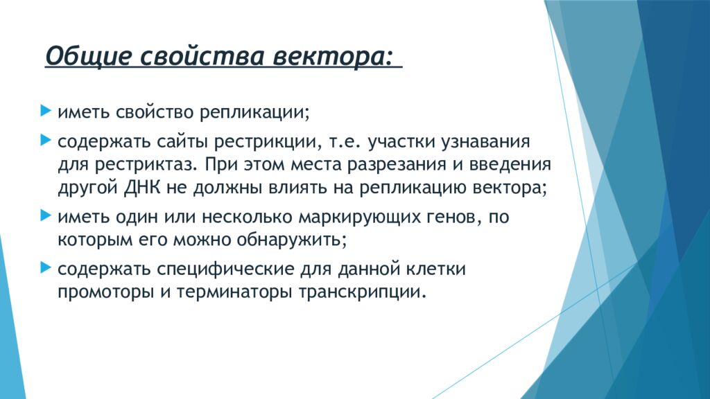 иметь свойство репликации; содержать сайты рестрикции, т.е. участки узнавания для рестриктаз. При этом места разрезания и введения другой ДНК не должны влиять на репликацию вектора ; иметь один или несколько маркирующих генов, по которым его можно обнаружить ; содержать специфические для данной клетки промоторы и терминаторы транскрипции.