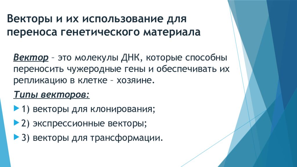 Вектор – это молекулы ДНК, которые способны переносить чужеродные гены и обеспечивать их репликацию в клетке – хозяине. Типы векторов: 1) векторы для клонирования; 2) экспрессионные векторы; 3) векторы для трансформации.