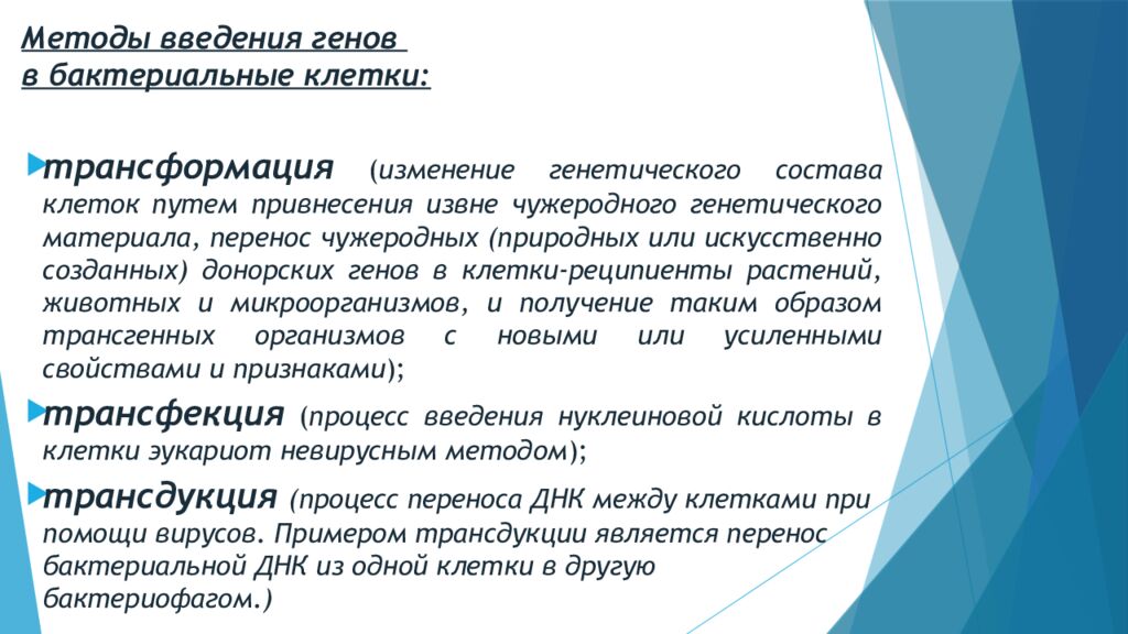 трансформация ( изменение генетического состава клеток путем привнесения извне чужеродного генетического материала, перенос чужеродных (природных или искусственно созданных) донорских генов в клетки-реципиенты растений, животных и микроорганизмов, и получение таким образом трансгенных организмов с новыми или усиленными свойствами и признаками ); трансфекция ( процесс введения нуклеиновой кислоты в клетки эукариот невирусным методом ); трансдукция ( процесс переноса ДНК между клетками при помощи вирусов. Примером трансдукции является перенос бактериальной ДНК из одной клетки в другую бактериофагом. )