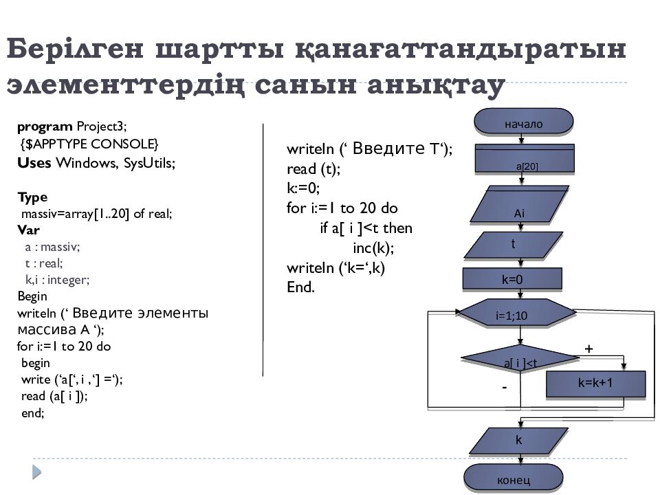 program Project 3 ; {$APPTYPE CONSOLE} Uses Windows, SysUtils ; Type massiv =array[1..20] of real; Var a : massiv ; t : real; k,i : integer; Begin writeln ( ‘ Введите элементы массива A ‘ ); for i :=1 to 2 0 do begin write (‘a[‘, i, ‘] =‘); read (a[ i ]); end; начало Ai a[20] конец k i =1;10 a[ i ]<t writeln ( ‘ Введите T‘ ); read (t); k:=0; for i:=1 to 20 do if a[ i ]<t then inc(k); writeln (‘k=‘,k) End. t k=k+1 + - k=0