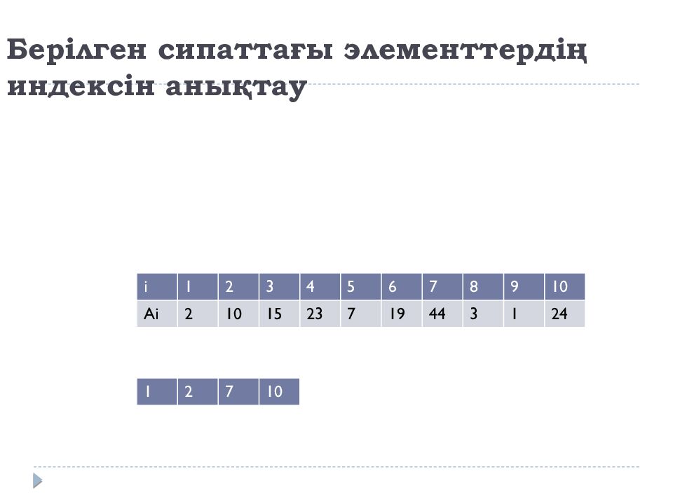 Слайд 14: Берілген сипаттағы элементтердің индексін анықтау