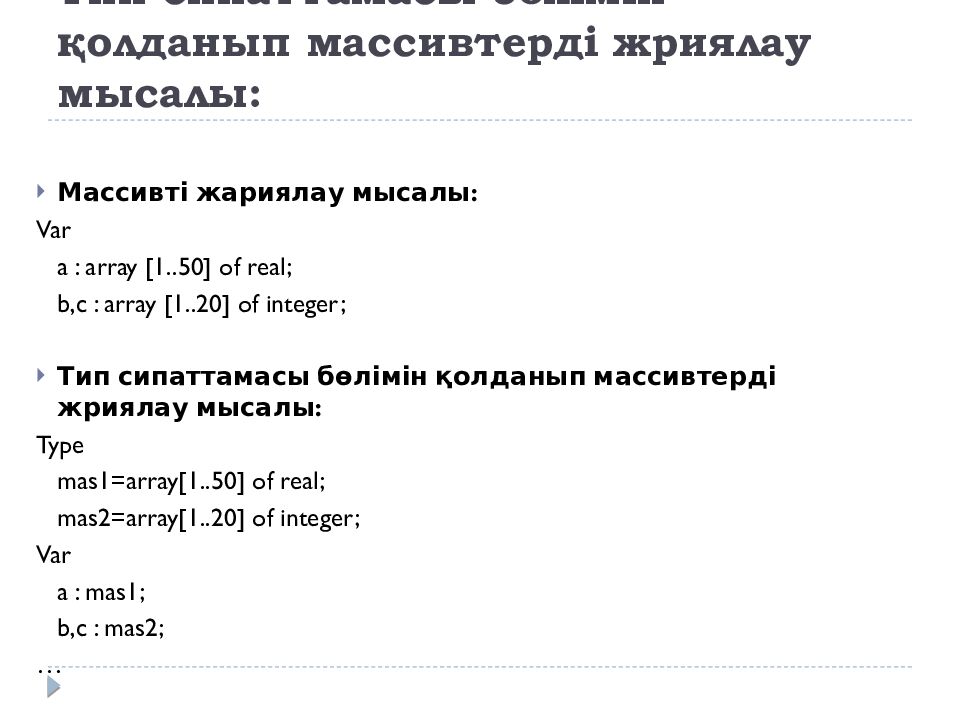Массивті жариялау мысалы: Var a : array [1..50] of real; b,c : array [1..20] of integer; Тип сипаттамасы бөлімін қолданып массивтерді жриялау мысалы: Type mas1=array[1..50] of real; mas2=array[1..20] of integer; Var a : mas1; b,c : mas2; …