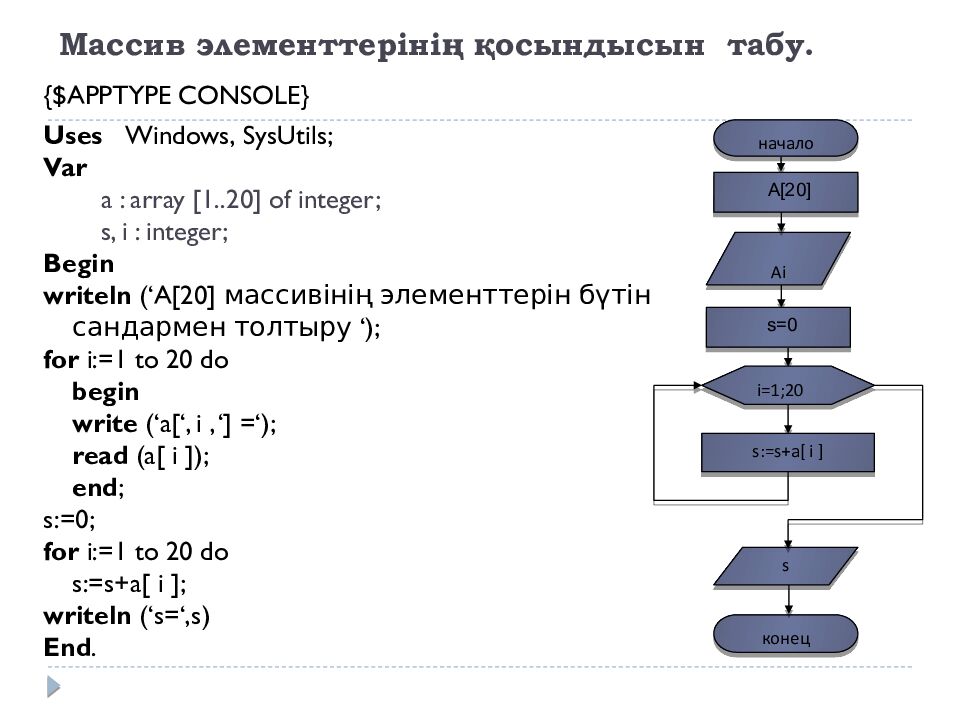 {$APPTYPE CONSOLE} Uses Windows, SysUtils ; Var a : array [1..20] of integer; s, i : integer; Begin writeln ( ‘ A[ 20] массивінің элементтерін бүтін сандармен толтыру ‘ ); for i :=1 to 20 do begin write (‘a[‘, i, ‘] =‘); read (a[ i ]); end ; s:=0; for i :=1 to 20 do s:= s+a [ i ]; writeln (‘s=‘,s) End. начало Ai A[20] конец s i =1;20 s:= s+a [ i ] s=0