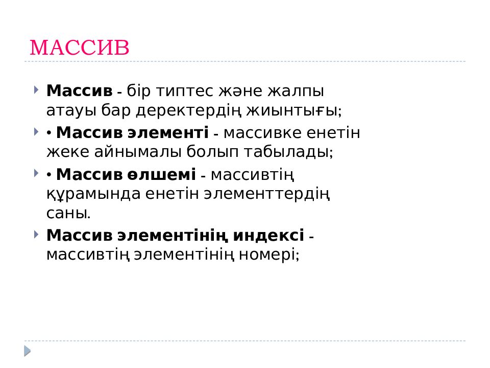 Массив - бір типтес және жалпы атауы бар деректердің жиынтығы; • Массив элементі - массивке енетін жеке айнымалы болып табылады; • Массив өлшемі - массивтің құрамында енетін элементтердің саны. Массив элементінің индексі - массивтің элементінің номері;