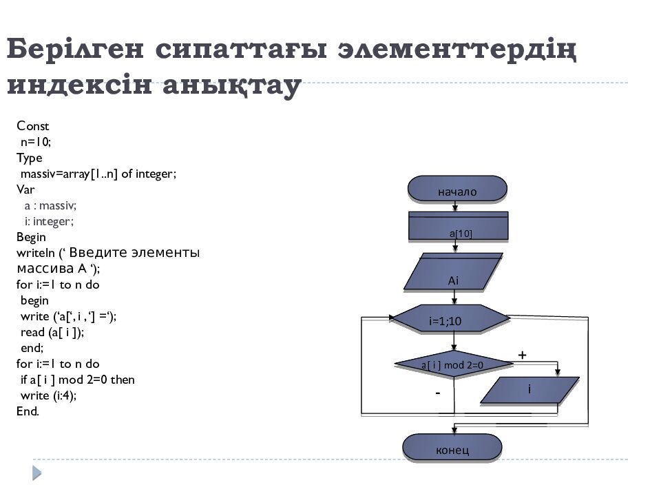 С onst n=10; Type massiv =array[1..n] of integer; Var a : massiv ; i : integer; Begin writeln ( ‘ Введите элементы массива A ‘ ); for i :=1 to n do begin write (‘a[‘, i, ‘] =‘); read (a[ i ]); end; for i :=1 to n do if a[ i ] mod 2=0 then write (i:4); End. начало Ai a[10] конец i =1;10 i + - a[ i ] mod 2=0